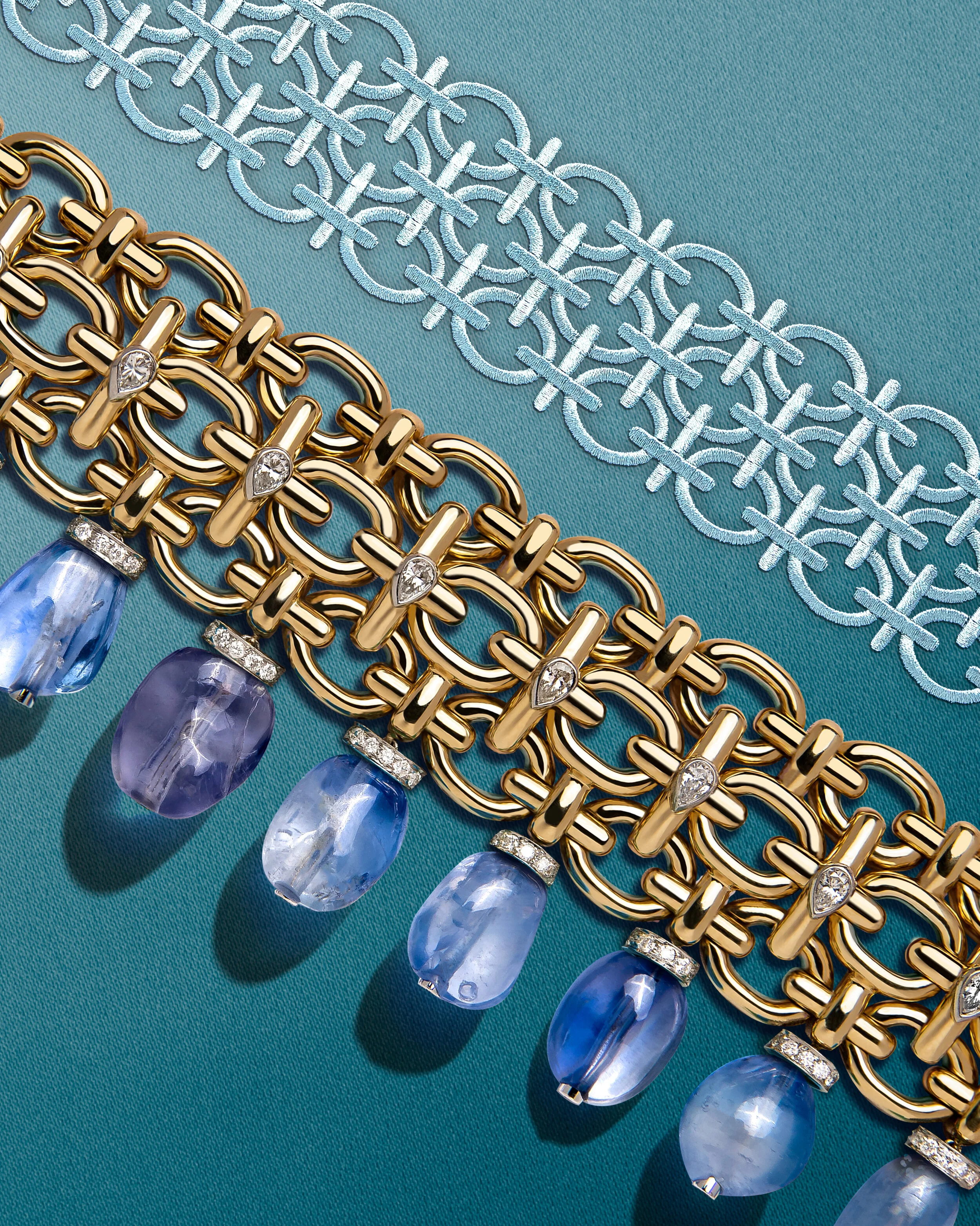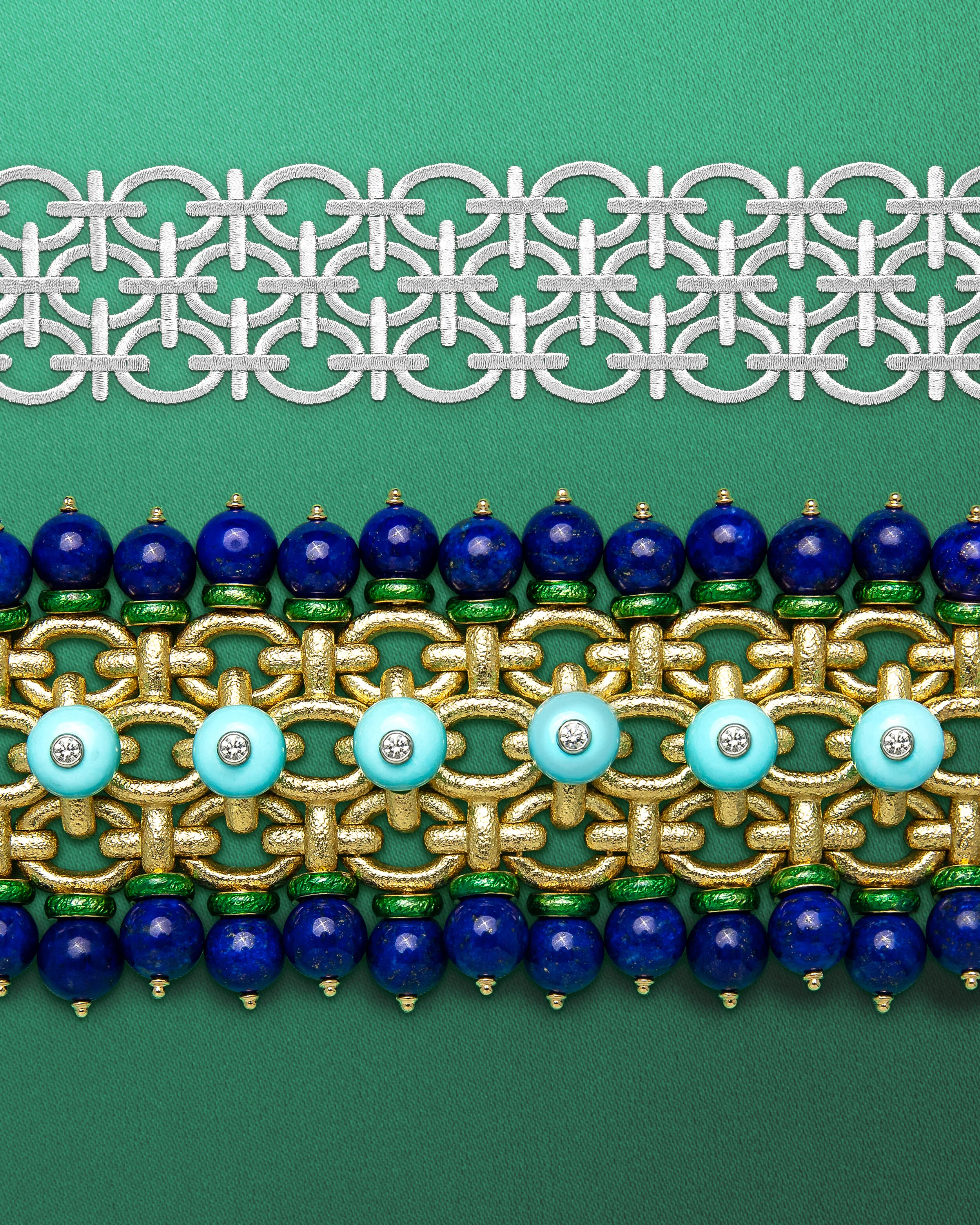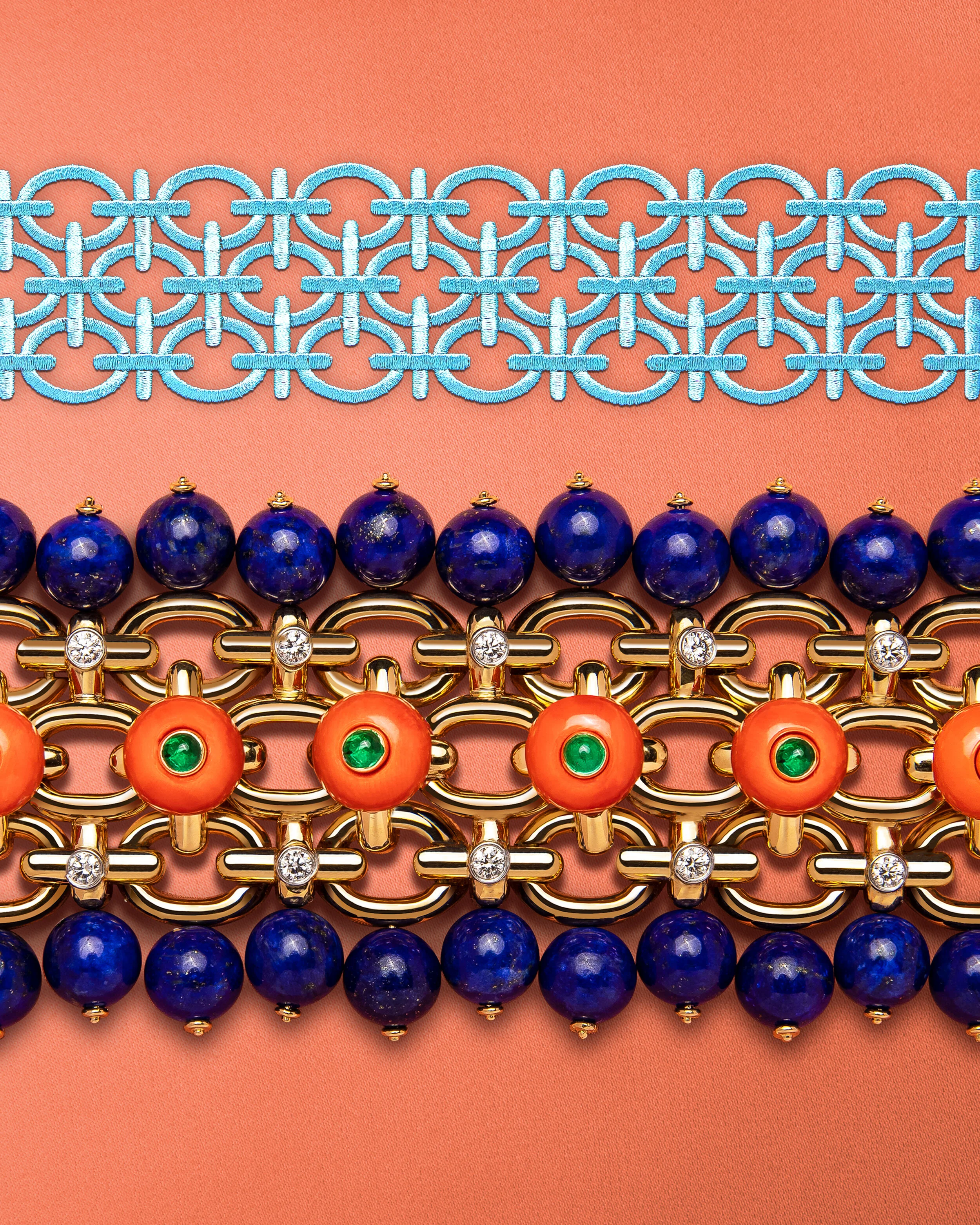 David Webb is an icon of Manhattan jewelry design. Since the 1970’s their bold approach has set them apart. These campaign images were created for their website and social media, pairing their distinct Brocade bracelets with custom-embroidered silk.